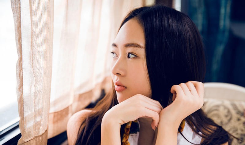 童瑶侧坐窗前光影交织 微露香肩凝望远方